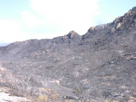 ![]() Fire came up canyon & ridge. Mt Bigelow is visible in the distance. |