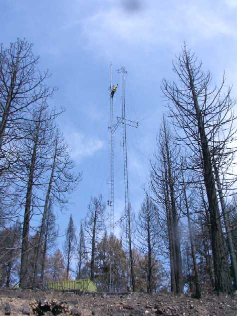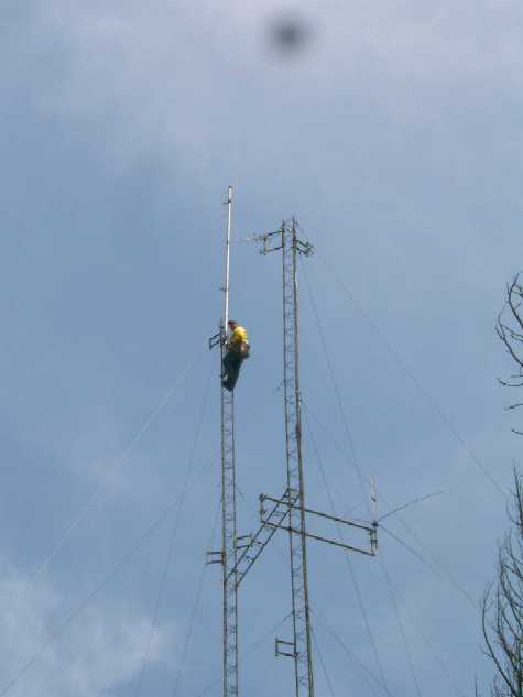 ![]() Jason on tower to remove 147.16 rptr antenna destroyed in fire. |